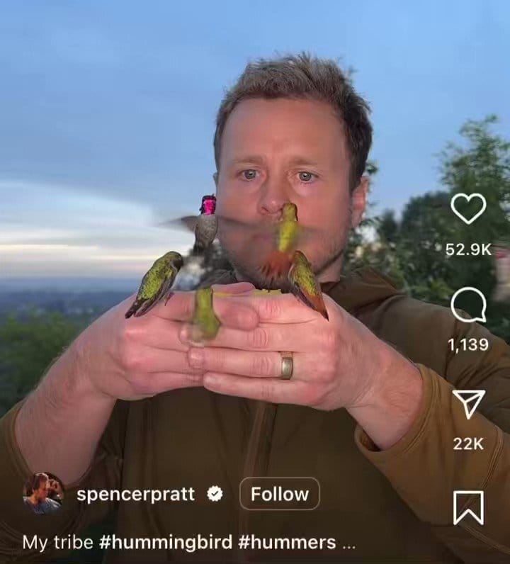 About 10 years later, in 2018, Spencer began consistently going viral on TikTok for his hummingbird videos. I think something about him and Heidi still being together, having two kids, and him being a big bird guy, hit just the right “huh?” on the timeline for him to amass a renewed found fandom.
