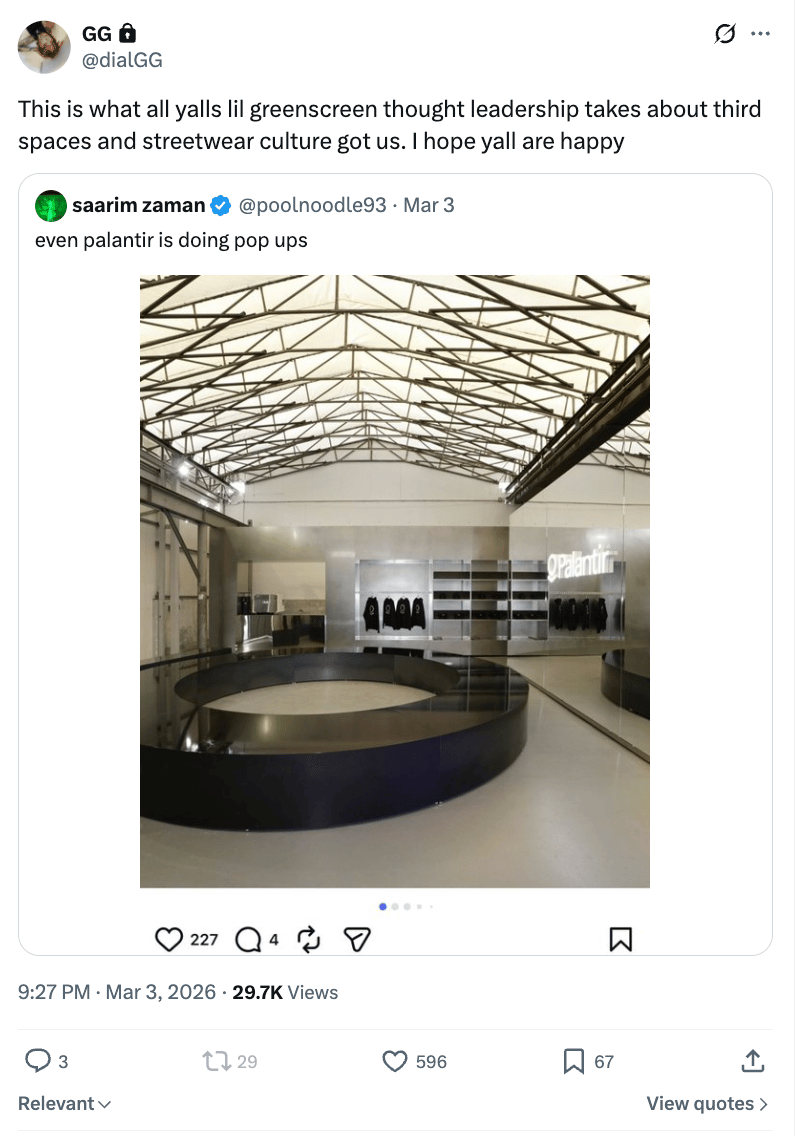 All of this to say, these are incredibly serious companies doing highly controversial, literally life-and-death work, so when their swag is sported casually on the timeline, it’s a jump scare.