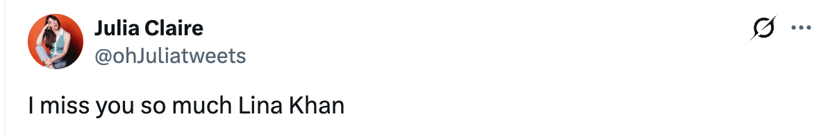 As well as greatly missing Lina Khan, the former head of the Federal Trade Commission, who was famously a cock block for mergers and acquisitions and consistently came down tough on monopoly regulation.