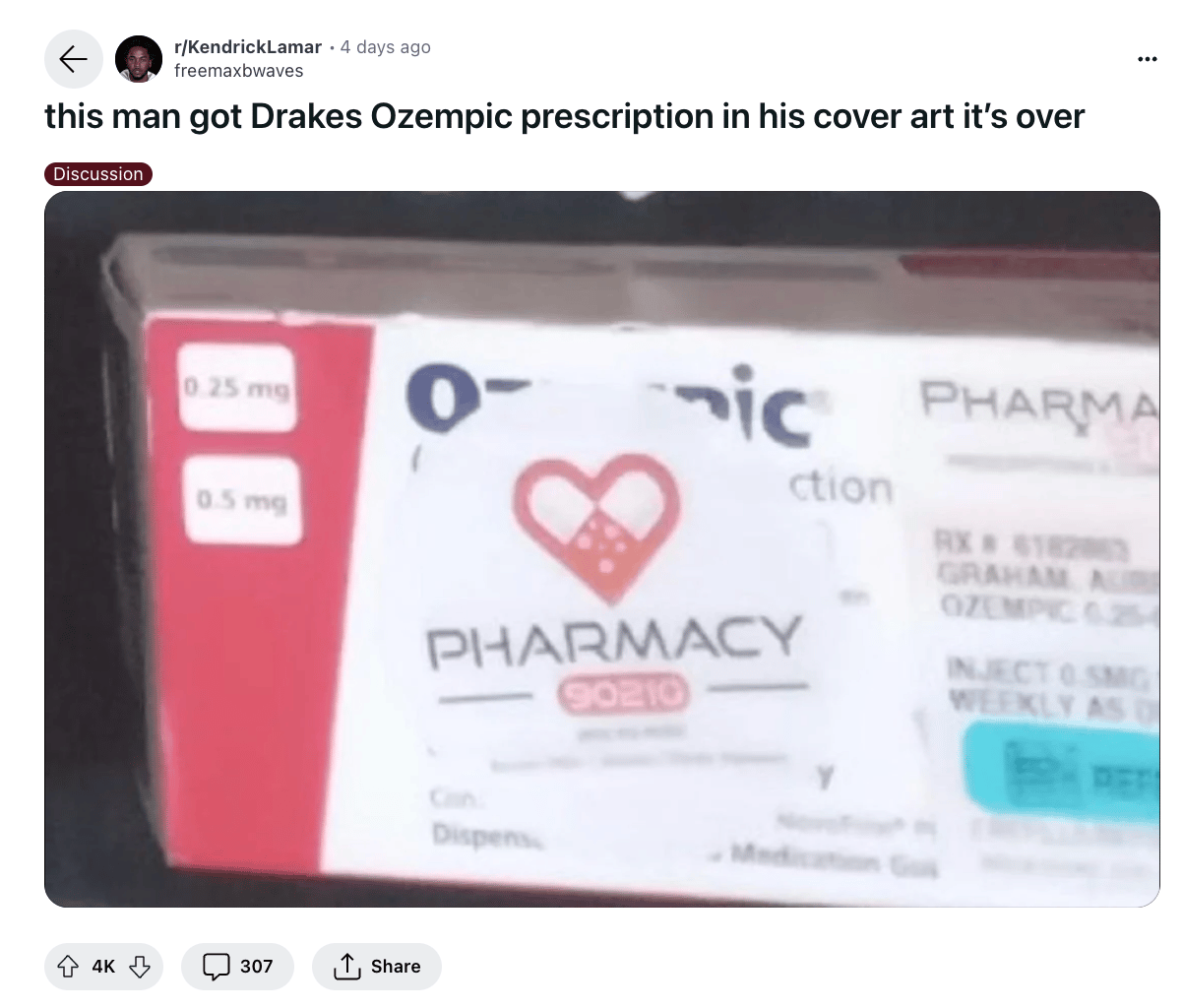 Diss track Summer. The craze of Ozempic allegations even made it into one of Kendrick’s diss tracks. The original cover art of "Meet the Grahams" included Drake’s alleged Ozempic prescription. It was later swapped for a black cover, either because it violated Spotify, Apple and/or HIPAA’s guidelines or because he was embarrassed about being fed fake news. You be the judge.