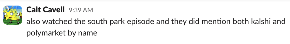 Next, prediction market pettiness continued this week when South Park released their highly anticipated episode centered on the new betting platforms. Polymarket and Kalshi fans had wondered which prediction market, if any, would be name dropped in the segment.